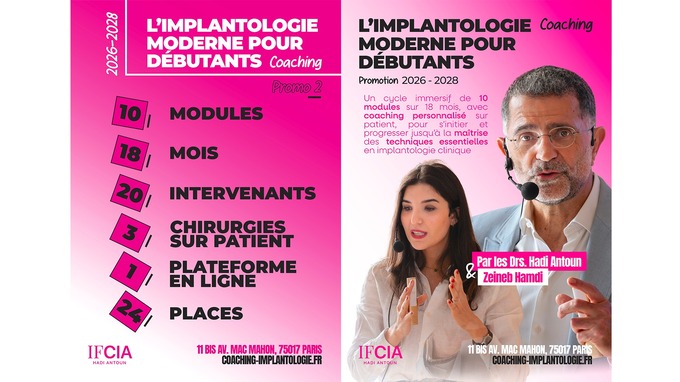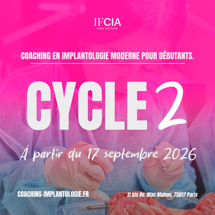 Cette nouvelle formation IFCIA est la deuxième édition de formation continue de l’Institut IFCIA, depuis sa création par le Dr. Hadi Antoun en 2003 ! Du 17 septembre 2026 au 4 février 2028, cette formation continue de 18 mois offre aux chirurgiens-dentistes une base scientifique solide et une expérience pratique unique en matière de pose d'implants dans les locaux d'IFCIA. Chaque participant réalisera trois interventions chirurgicales de pose d'implants sur leur patients, chirurgies à main levée et guidée.