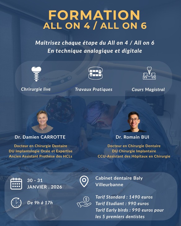 Le Dr Damien Carrotte et le Dr Romain BUI vous proposent une formation sur le all on 4 / 6 .