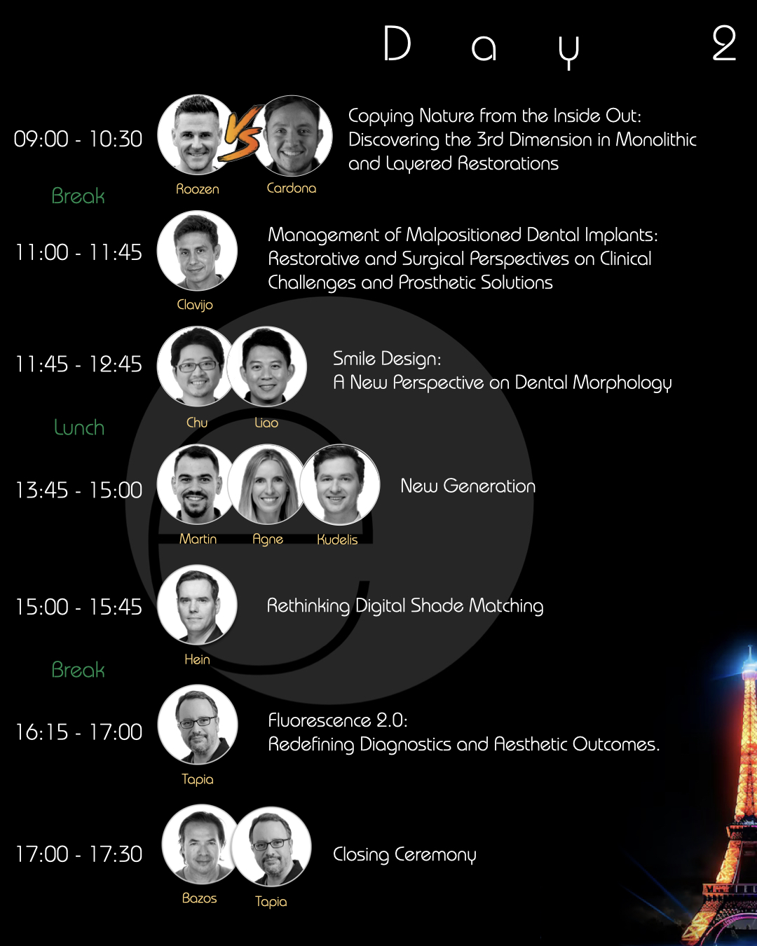 Nous sommes extrêmement fiers d'avoir réuni un panel aussi incroyable de 27 conférenciers de renommée mondiale, chacun étant un expert dans son domaine. Pour cette édition, nous sommes ravis de présenter de nouveaux formats de conférences : des débats pour discuter de différentes approches, des sessions en duo ou en trio pour approfondir les sujets et partager des idées plus précieuses, et enfin une session « nouvelle génération » donnant la parole à de jeunes dentistes motivés en quête d'excellence. De plus, nos 8 ateliers vous offriront la possibilité de perfectionner vos compétences et d'appliquer les concepts de bio-émulation dans votre pratique quotidienne.