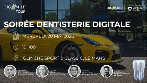 <p>Le Digismile Tour fait étape au Mans le 20 mai pour une soirée dédiée à la dentisterie digitale, placée sous le signe de l’échange et du partage d’expérience.<br>Dans un cadre d’exception, vous aurez l’opportunité d’assister à des mini-conférences animées par des praticiens experts en numérique, autour des workflows digitaux en cabinet : planification implantaire, conception 3D, intégration des outils digitaux et organisation clinique.<br><br>Un moment privilégié pour découvrir, approfondir et échanger autour des dernières innovations en dentisterie digitale.</p>