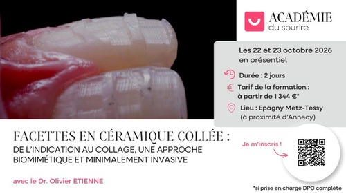 De l'adhésion aux facettes, intégrez l’esthétique dans votre quotidien, grâce à des protocoles et un apprentissage pratique dans les conditions réelles du cabinet.